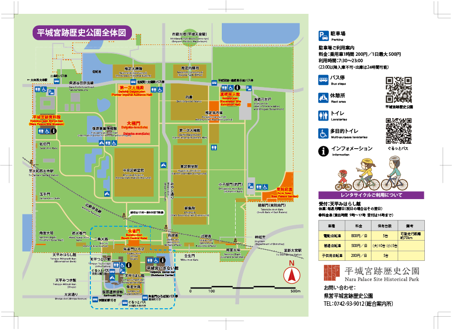 - 駐車場: 奈良町商店街周辺にはコインパーキングあり。奈良ファミリーは駐車場が完備(500台、1時間無料)。平城宮跡歴史公園は無料駐車場あり(300台)。